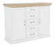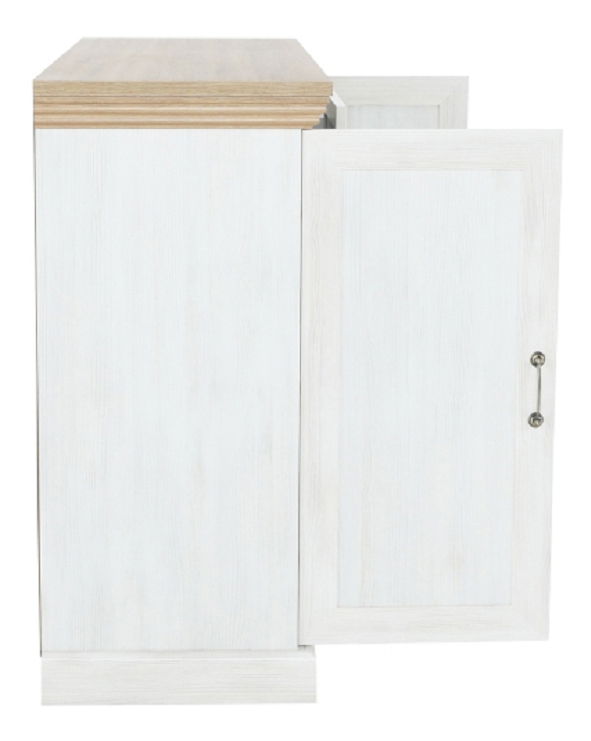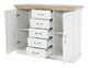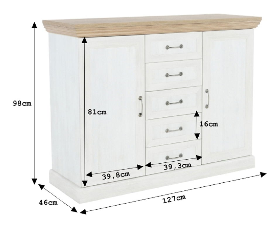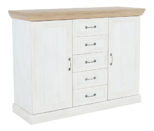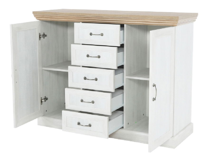 Komoda Royal se dvěma dvířky a pěti zásuvkami má svěží vzhled, vrchní ozdobnou lištu a vyznačuje se i svou praktičností. Využijete ji v obývácích, pracovnách nebo ložnicích. Je v provedení bílá sosna nordická v kombinaci s dubem divokým.