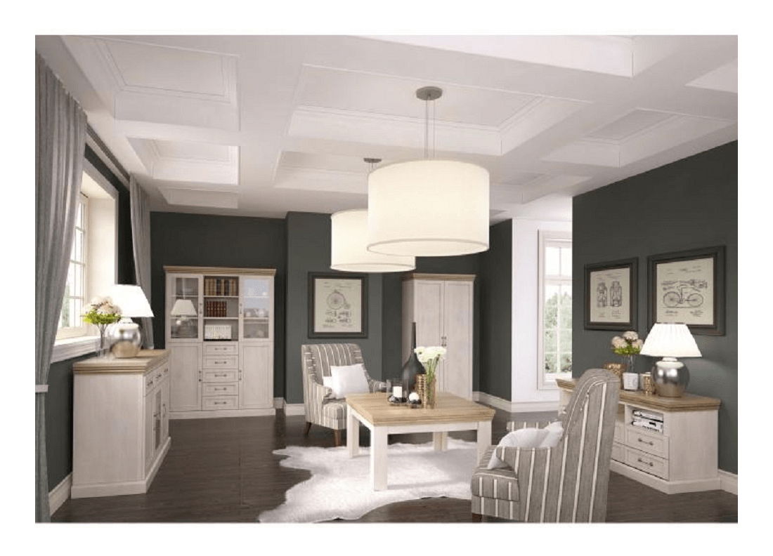 Elegantní sektorový nábytek Royal v sobě kombinuje svěžest, masivnější vzhled a anglický styl. Prosvětlí a zkrášlí prostory vašich obýváků, jídelen, ložnic, pracoven nebo předsíní i díky barevnému provedení bílé sosny nordické v kombinaci s dubem divokým. Komponenty této modelové řady mají ozdobné lišty a kovové úchyty. Oblíbí si ho určitě ti, kteří mají rádi nábytek tradičnějšího vzhledu.