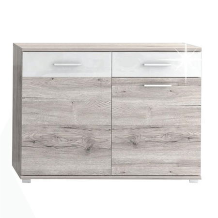 Trendová komoda, která umí potěšit oko v každé místnosti. Vybavena je 2 dvířky, za kterými se nachází 1 polička. V pravé horní části se v bílé barvě ve vysokém lesku nachází jedna zásuvka. korpus a zbytek dveří je provedení dub Canyon. Úchyt je šedý a materiál je DTD laminovaná.