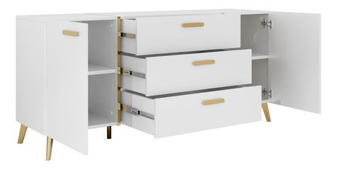 ZobrazitKomoda je ideální volbou pro ty, kteří hledají pohodlí a styl. Obývací komoda Rostiw 150 2D3SZ je dokonalým řešením do každého interiéru. Skvěle poslouží v obýváku jako elegantní designový akcent, v ložnici jako funkční prostor pro uložení oblečení a v předsíni pomůže zorganizovat obuv a doplňky. Třpytivá čela a zlaté detaily dodávají komodě na nožičkách úžasný výraz. Prostorné zásuvky jsou ideálním místem pro drobnosti, které se vyplatí mít po ruce, ale nemusí být na očích – dokumenty, doplňky či textilie si v nich najdou své místo. Dvě uzamykatelné skříňky poskytují další prostor pro větší předměty. Takto řešený interiér komody pomáhá udržovat pořádek v domácnosti. Rozměry: šířka: 154 cm výška: 92 cm hloubka: 38 cm Provedení: korpus a přední část: 16 mm silná dřevotříska ABS hrana zadní stěna z HDF desky nohy a rukojeti: zlatý plast kuličková vedení Záruka: 24 měsíců