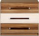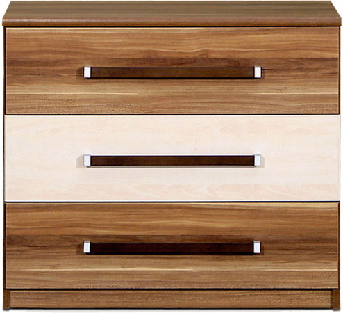 Komoda se třemi zásuvkami s výraznými úchyty dodávána v provedení švestka. Horní zásuvka má front v odstínu klon.