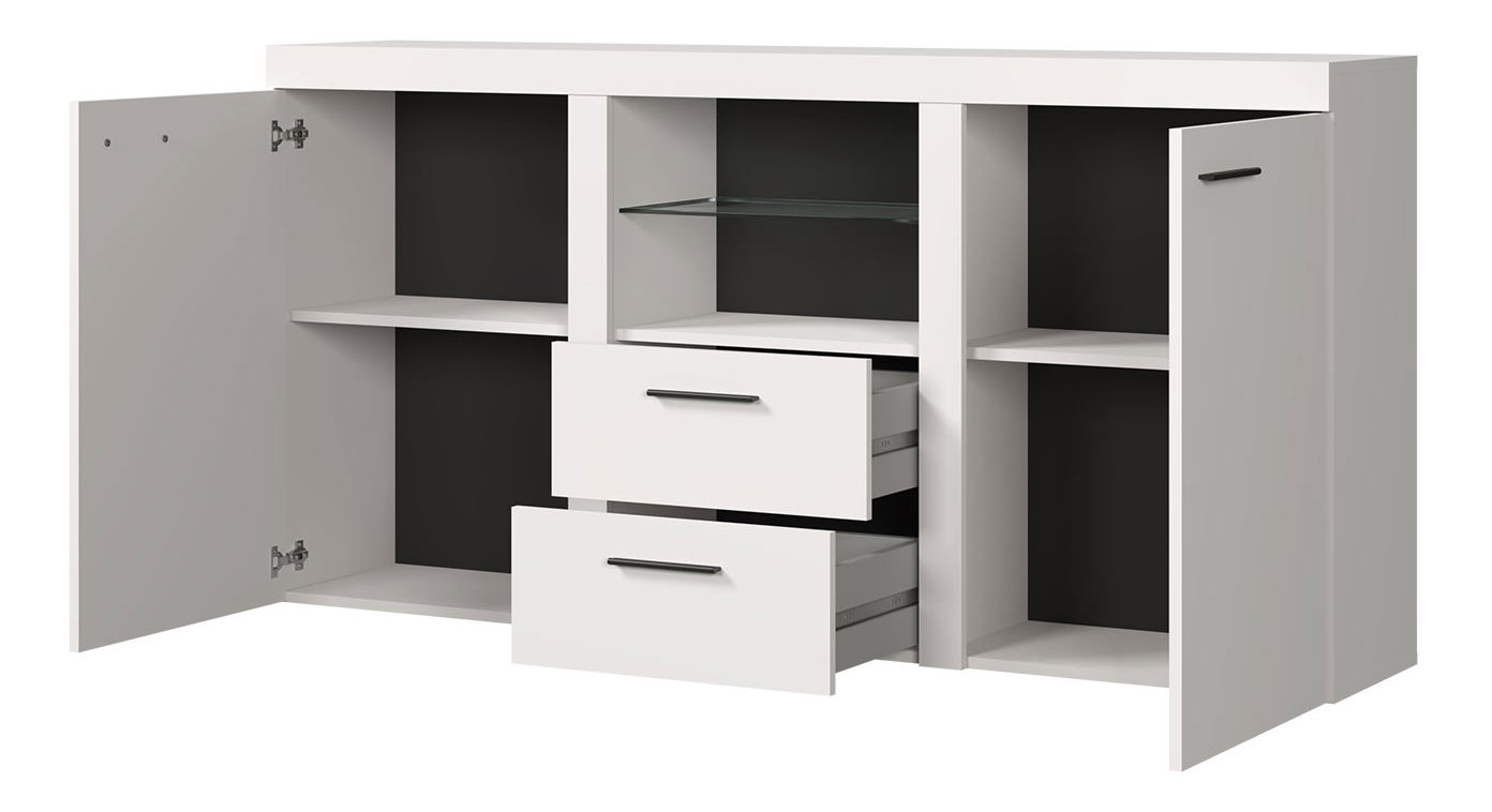 Prostorná komoda moderního stylu je praktickým doplňkem k obývací stěně. Nabízí množství úložného prostoru. Je třídílná, přičemž uprostřed se nacházejí 2 zásuvky, nad nimiž je otevřený prostor na audio/video techniku se skleněnou poličkou. Po stranách jsou dvě skříňky. V každé skříňce se nachází jedna dřevěná polička. Moderním a velmi efektním doplňkem v dnešní době je LED osvětlení. To si můžete přiobjednat i Vy. Krásné podsvítí skleněnou poličku a navodí příjemnou atmosféru v místnosti.