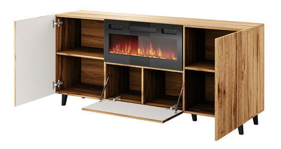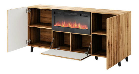 ZobrazitKombinace elegance a moderních řešení je stručným popisem komody Trilari. Charakteristickým prvkem komody jsou ozdobné lamely. Kromě toho nemá tradiční rukojeti, byly nahrazeny vyčnívajícími čely. Další výhodou komody je elektrický krb. Má dekorativní funkci, protože LED světlo napodobuje realistický obraz a funkci vytápění. Krb má funkci vytápění v rozmezí 16-28 °C. Součástí balení je také dálkové ovládání. Komoda s elektrickým krbem je postavena na vysokých nohách, což jí dodává módní styl.