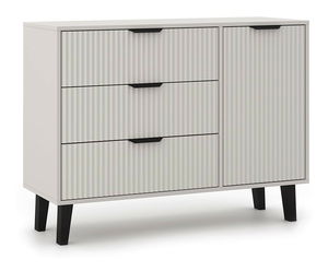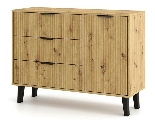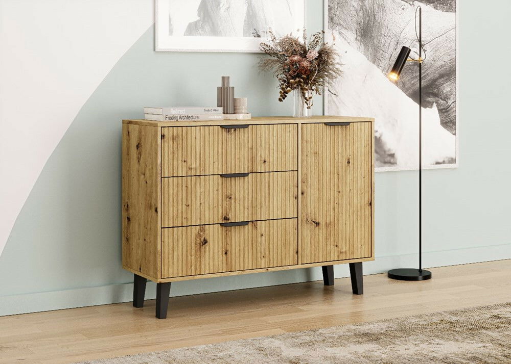 ZobrazitKomoda Sacar 1 je moderní kus nábytku, který dokonale spojuje funkčnost a estetiku, ideální pro interiéry inspirované skandinávským stylem. S rozměry 110 cm na šířku a 39 cm na hloubku nabízí dostatek úložného prostoru v podobě tří prostorných zásuvek a jedné skříňky s poličkou. Její elegantní drážkované fronty v odstínu dub artisan, doplněné černými plastovými úchyty a vysokýma nohama, dodávají komodě vzdušnost a moderní vzhled. Tento nábytek je vyroben z odolné laminované dřevotřísky, což zaručuje snadnou údržbu a dlouhou životnost.