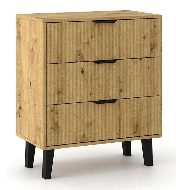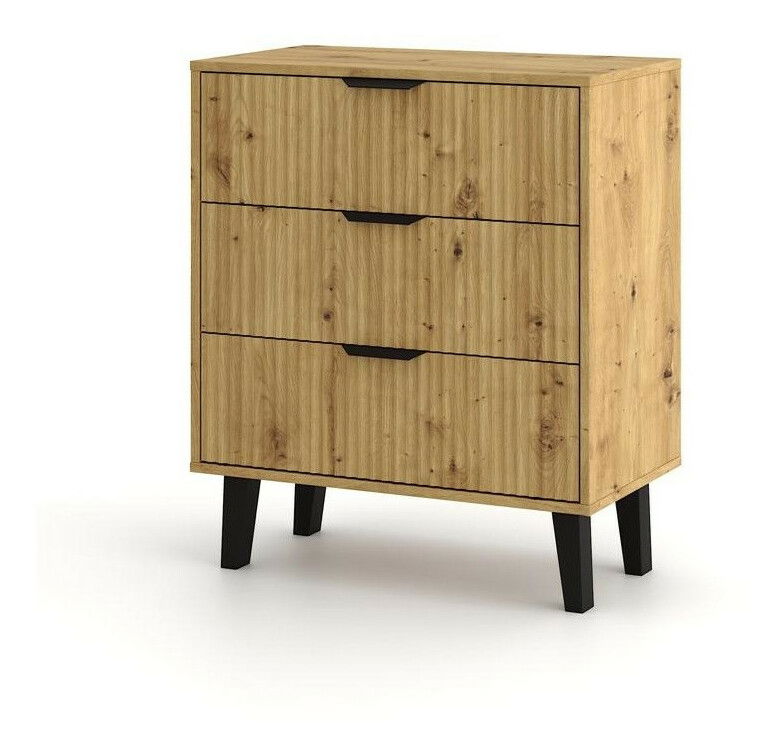ZobrazitKomoda Sacar 2 je skvělým řešením pro ty, kteří hledají moderní a praktický nábytek pro uskladnění. S jejím teplým odstínem dubu artisan a elegantními drážkovanými frontami dodává každému interiéru nádech útulnosti a stylu. Má tři prostorné zásuvky, které jsou ideální pro pořádání oblečení, dokumentů či různých drobností, čímž zajišťuje pořádek ve vaší ložnici, obývacím pokoji nebo předsíni. S vysokými černýma nohama, které usnadňují údržbu, je tato komoda nejen estetická, ale také funkční.