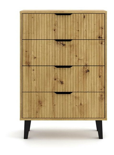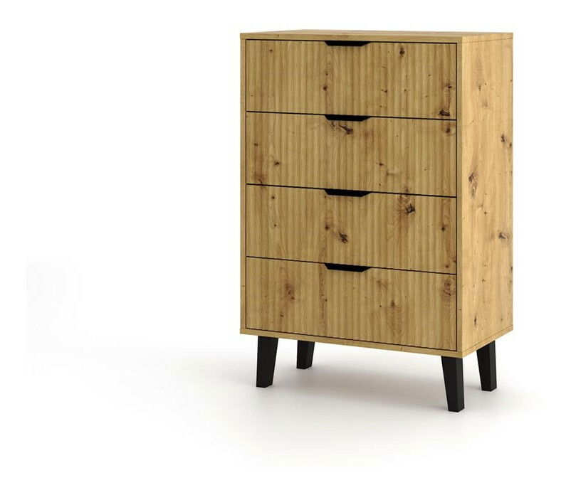 ZobrazitKomoda Sacar 3 je ideálním řešením pro ty, kdo hledají praktický a stylový nábytek do svého interiéru. S teplým odstínem dubu artisan a elegantními drážkovanými frontami, tato komoda dodává prostoru příjemnou atmosféru. Čtyři prostorné zásuvky umožňují efektivní uskladnění oblečení, dokumentů či různých drobností, přičemž zachovávají pořádek a estetiku v ložnici, obývacím pokoji nebo předsíni. Vysoké černé nohy nejenže zvyšují její moderní vzhled, ale také usnadňují údržbu podlahy. Tento kus nábytku je kombinací funkčnosti a designu, který obohatí každý domov.