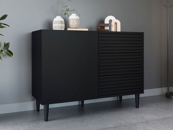 Tato jedinečná obývací komoda Sarlana1D3SZ byla vytvořena tak, aby vyhovovala vašim potřebám a dodala vašemu pokoji jedinečné kouzlo. Nabízí tři prostorné zásuvky a dvě uzavřené police, které poskytují dostatek prostoru pro uložení různých předmětů. Snadno si tak uspořádáte své osobní věci, spodní prádlo, doklady a jiné drobnosti. Pokojová komoda má elegantně profilované vysoké nohy, které dodávají lehkost a zdůrazňují její moderní design. Navíc to usnadňuje udržování okolí nábytku v čistotě. Minimalistický design interiéru zdůrazňují ozdobná čela bez viditelných úchytek. Systém „push to open“ usnadňuje otevírání a zavírání zásuvek a dvířek jedním lehkým stisknutím. Komoda bude perfektním doplňkem do každého obývacího pokoje, ložnice či předsíně. Díky ní můžete mít doma pořádek, aniž byste obětovali eleganci a modernost.
