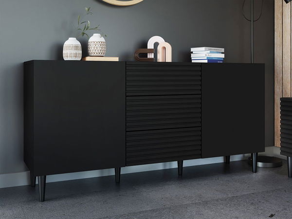 Široká komoda Sarlana 2D3SZ je spojením stylu a praktičnosti. Pokud hledáte kus nábytku, který dodá vašemu interiéru charakter a svěžest a zároveň poskytne dostatek úložného prostoru, právě jste našli to, co potřebujete. Jednou z hlavních výhod pokojové komody jsou její četné, prostorné úložné prostory. Naleznete zde dostatek místa pro uložení vašich oblíbených věcí. Navíc byl navržen v mimořádném stylu. Komoda má frézovaná čela, která nejen dodávají nábytku charakter a eleganci. Varianta je navíc bez tradičních úchytek. Namísto toho byl použit moderní systém otevírání „Push to open“. K otevření úložného prostoru stačí jemně zatlačit na přední část.