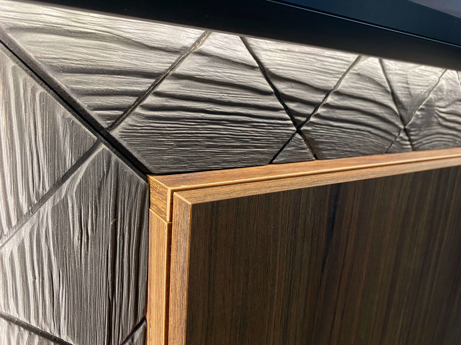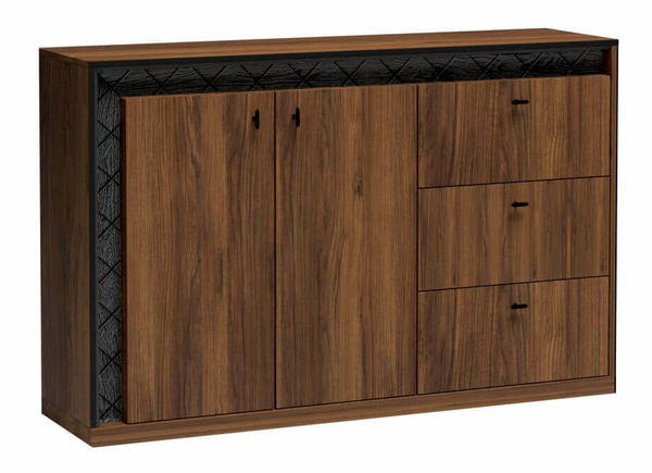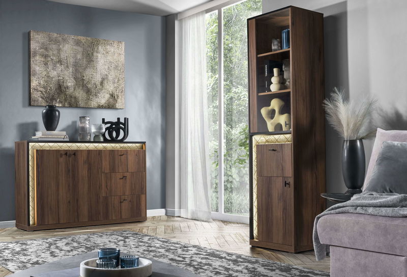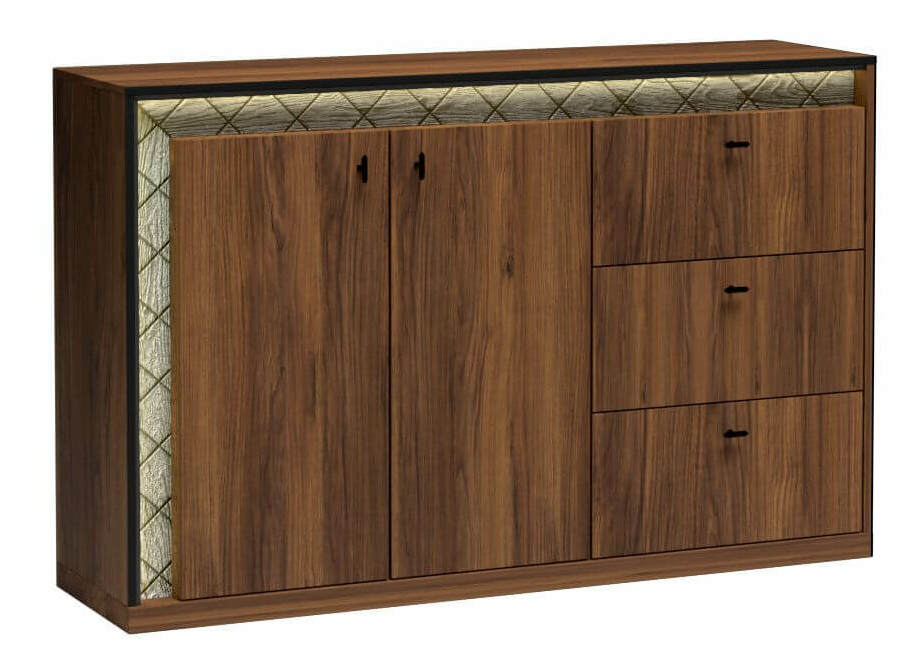 ZobrazitVelká komoda pro uložení oblečení. Pohodlné tři zásuvky na pravé straně jsou dokonalým řešením pro udržení pořádku v ponožkách, halenkách nebo svetrech. Za dvířky skříněk, které mají systém měkkého zavírání, se nachází police, která se dá využít pro jiné věci. Ořechovou barvu komody zvýrazňuje černá borová deska v ozdobném vzoru. Večer dodá atmosféru osvětlení, které je v nábytku standardní možností.