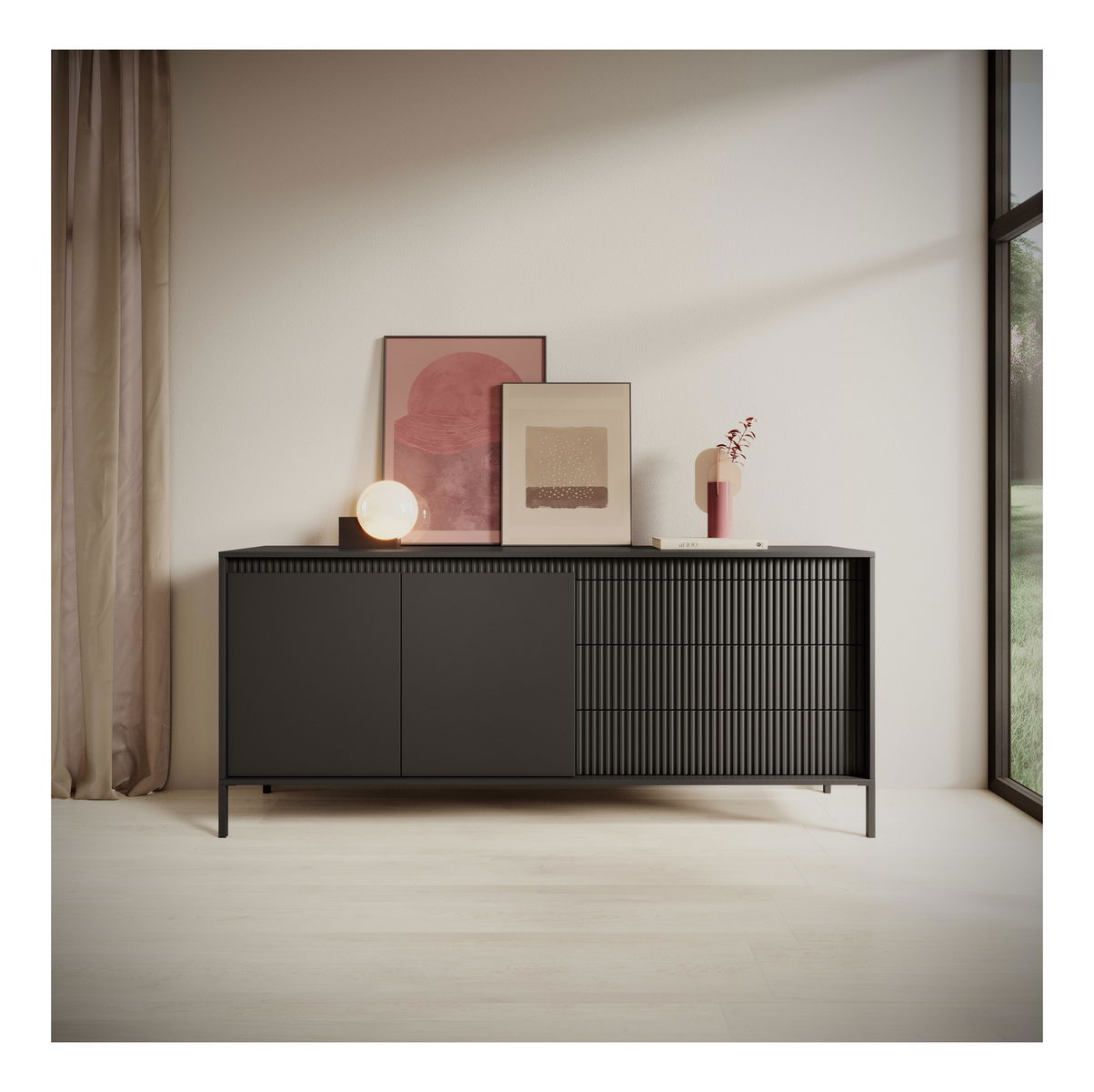 ZobrazitKomoda Sesen II (čierna) je štýlovým a praktickým doplnkom do vašej domácnosti. Vyrobená z laminovanej drevotriesky s MDF hrúbkou 16 mm po stranách aj na prednej časti, ponúka odolnosť a pevnosť. Komoda disponuje 3 zásuvkami a 1 dvierkami, poskytujúcimi dostatok úložného priestoru. Systém otvárania bez úchytiek na báze stlačenia dodáva moderný a čistý vzhľad. Béžové kovové nožičky zabezpečujú stabilitu a elegantný vzhľad. Táto komoda kombinuje funkčnosť a estetiku, ideálna pre každodenné použitie.