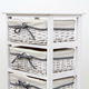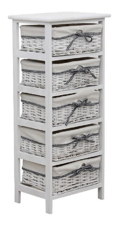 Rustikální styl si nachází stále více příznivců. Tato komoda využívá prvky rustikálního stylu a neplní pouze ozdobný účel, ale oceníte i její praktické využití například v předsíních, ložnicích nebo koupelnách. Má pět proutěných košíků, které jsou ozdobeny mašličkou. Barevné provedení komody je starobílá.
