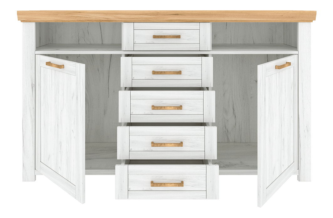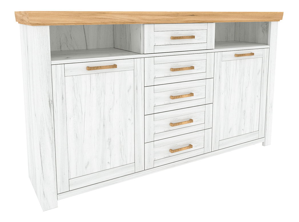 Komoda Soleus E je vysoce kvalitní nábytek, který vám poskytne dostatek úložného prostoru pro různé věci. Tento nábytek je vyroben z DTD laminované/MDF desky a má rozměry 167,9x41,8x96,7 cm. Korpus této komody má tloušťku 16 mm, vrchní deska 22 mm a dvířka 19 mm. Ve spodním prostoru se nachází pět velkých šuplíků, které vám pomohou udržet vaše věci dobře zorganizované. Kromě toho má tato komoda také dvě skříňky a otevřený prostor, které vám poskytnou další úložný prostor. Komoda Soleus E má moderní design a je k dispozici v provedení dub craft zlatý/dub craft bílý. Tento nábytek vám bude dodán v demontu, ale s jednoduchými instrukcemi k sestavení. Výška spodního prostoru od podlahy je 4,2 cm. Tato komoda je dokonalým doplňkem pro váš domov a pomůže vám udržet vaše věci dobře zorganizované.