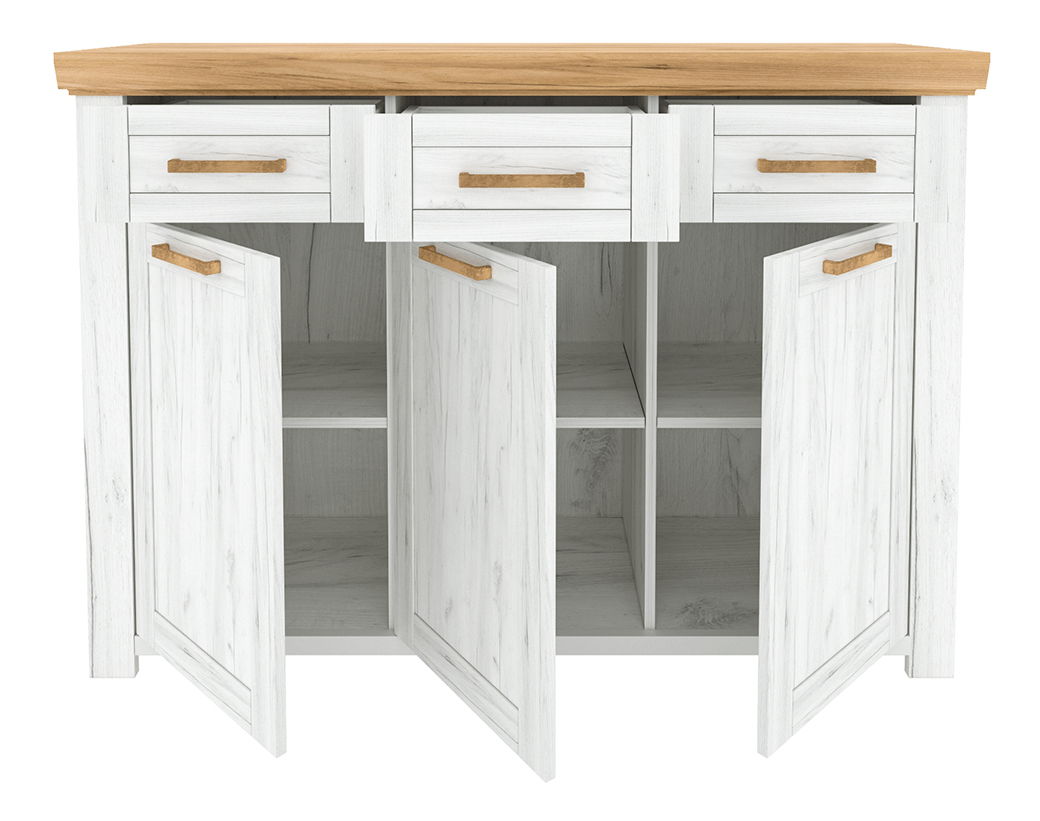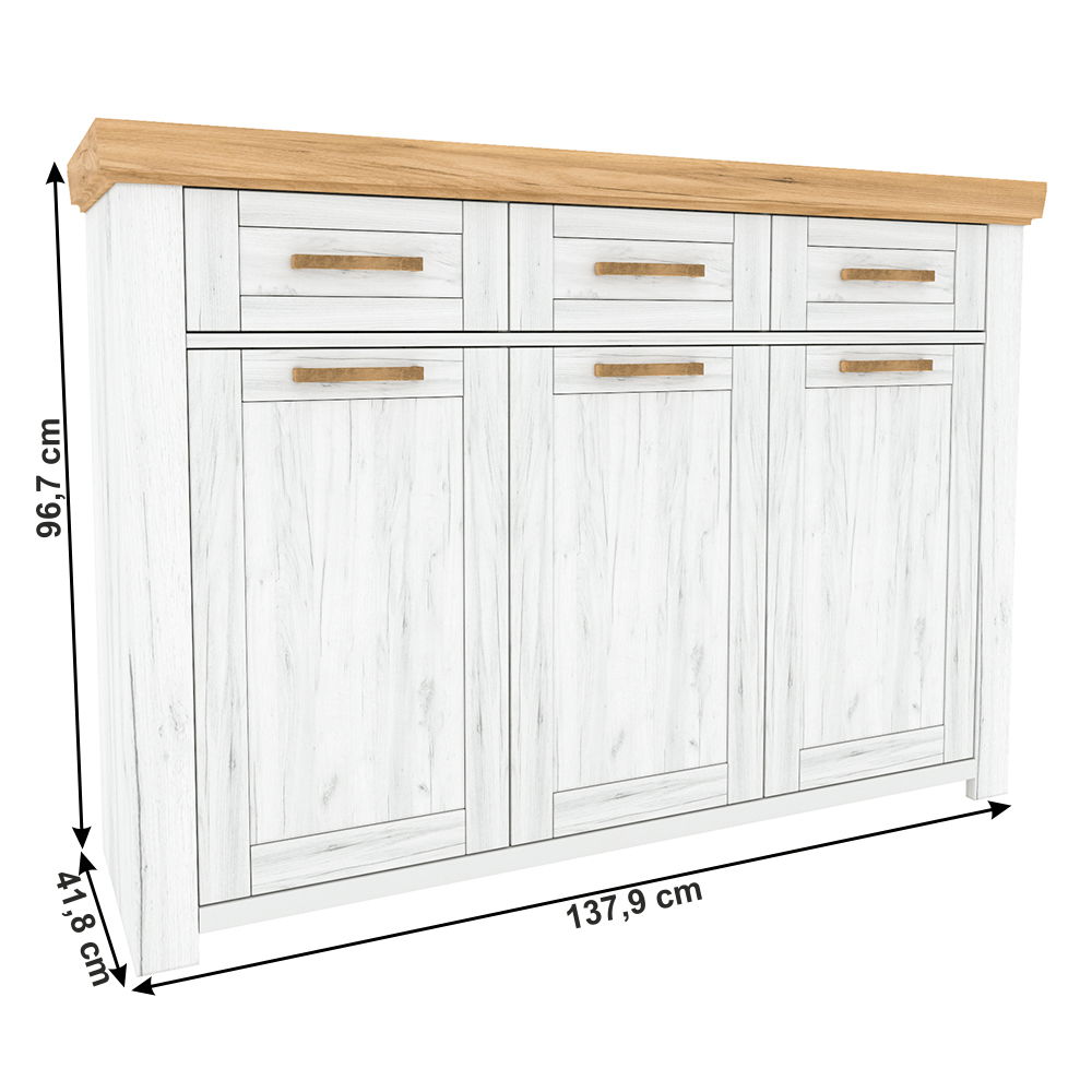 Komoda Soleus G v kombinaci dub craft zlatý a dub craft bílý je moderní kus nábytku, který bude skvělým doplňkem vašeho interiéru. Je vyrobena z kvalitního materiálu DTD laminovaná/MDF, což zaručuje dlouhou životnost a odolnost. Komoda má rozměry 68,3x41,8x199,7 cm a tloušťku materiálu korpusu 16 mm, tloušťku materiálu vrchní desky 22 mm a tloušťku materiálu dvířek 19 mm. Výška spodního prostoru je 4,2 cm. Komoda je vybavena třemi zásuvkami a třemi skříňkami, takže má dostatek úložného prostoru. Komoda je dodávána v demontu, což umožňuje jednoduchou a rychlou montáž. Tato moderní komoda vám pomůže udržet vaše věci v pořádku a vytvořit stylový a útulný domov.