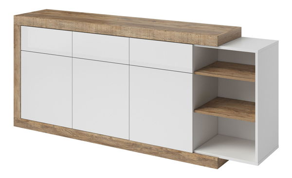 Komoda je rozdělena na čtyři části. Pravá část je rozšířena o regálovou část, tedy otevřený prostor v podobě polic. Hlavní část úložného prostoru je za dvířky. Vneste do svého domova jasnost a eleganci díky nábytku série Sophia.