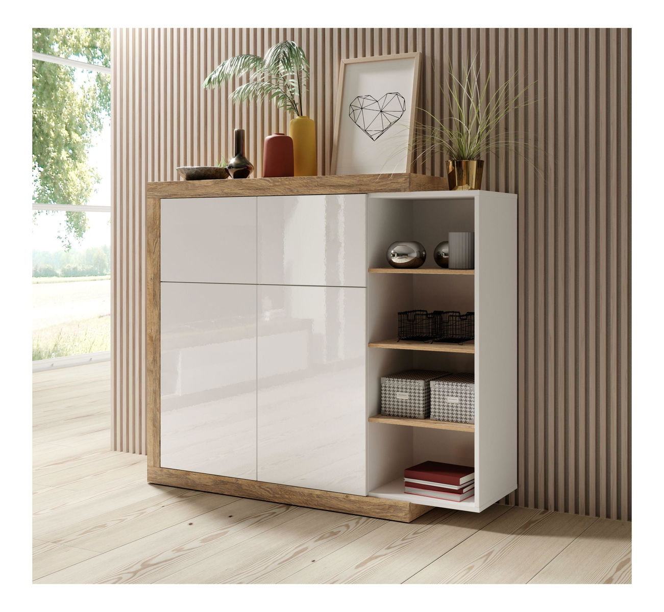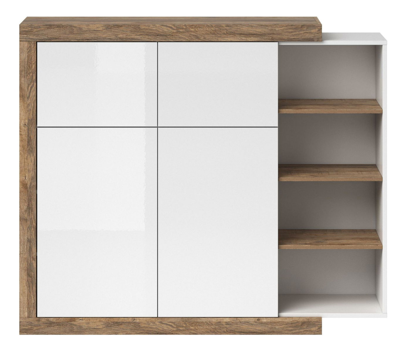 Komoda je rozdělena na tři části. Pravá část je rozšířena o regálovou část, tedy otevřený prostor v podobě polic. Hlavní část úložného prostoru je za dvířky. Vneste do svého domova jasnost a eleganci díky nábytku série Sophia.