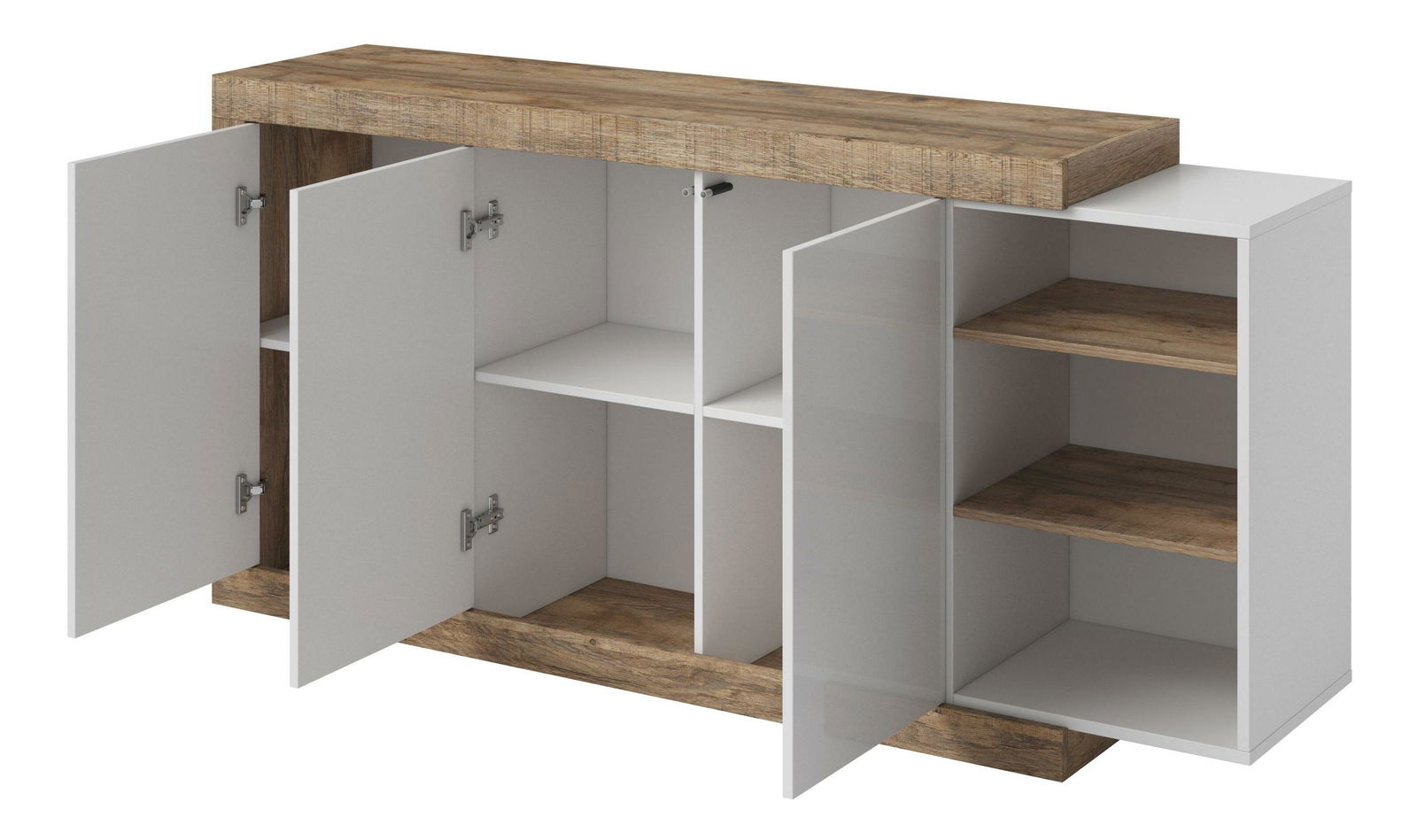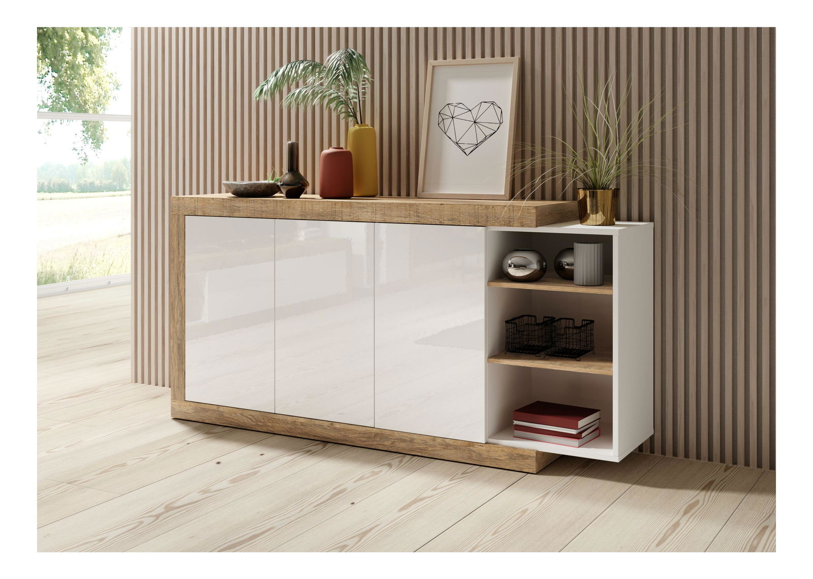 Komoda je rozdělena na čtyři části. Pravá část je rozšířena o regálovou část, tedy otevřený prostor v podobě polic. Hlavní část úložného prostoru je za dvířky. Vneste do svého domova jasnost a eleganci díky nábytku série Sophia.