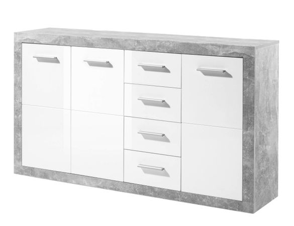 Komoda s výrazným orámováním šedé barvy a s frontami v bílém lesku. Komoda má čtyři zásuvky a troje dvířka.