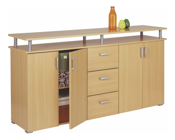 Čtyřdílná komoda v bukovém odstínu s horní vyvýšenou deskou na šedých nožičkách. Po stranách komody jsou skříňky se dvěma dvířky s poličkami uvnitř. Ve středu komody jsou umístěny 3 zásuvky nad sebou. Minimalistické šedé nožičky a úchyty.