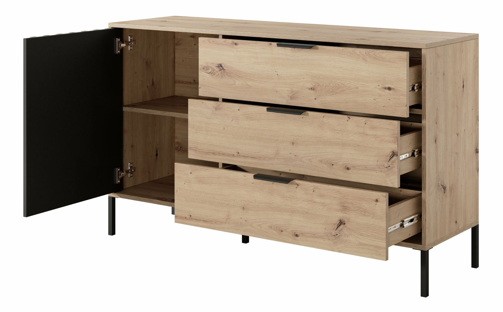 ZobrazitDokonalá kombinace tlumených zemitých barev v sadě TALLIN – dub s antracitem – dodává každé ložnici útulnou, přirozenou atmosféru. Lišty použité na čelech šatní skříně a komody, jakož i na čele postele dodávají kolekci modernost a zdůrazňují charakter jednotlivých kusů. Mimořádně funkční kolekce. Prostorná šatní skříň s velkým zrcadlem, osvětlením a šuplíky tvoří dokonalý celek s prostornou komodou a pohodlnou postelí, obohacenou o čalouněné čelo a užitečné noční stolky.