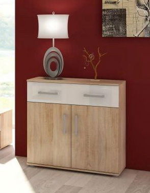 Praktická komoda se zásuvkou a dvěma dvířky, za kterými je police.
