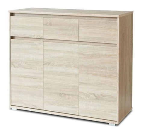 Třídveřová komoda se 3 zásuvkami v horní části v provedení dub sonoma. Hloubka až 50 cm.