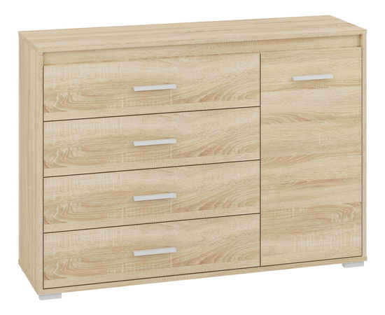 Komoda Teken 12 je kompaktní kus nábytku, který se hodí do každé místnosti. S výškou 85 cm a hloubkou 34 cm nabízí dostatek úložného prostoru pro vaše věci. Je vyroben z kvalitního materiálu dub sonoma světlý, který zajišťuje dlouhou životnost a vysokou odolnost vůči poškození. Současně je tato komoda elegantní a moderní, takže se bude hodit do každého interiéru. Teken 12 má 4 zásuvky, které jsou dokonale vyvážené a hladce se otevírají a zavírají. Spodní část komody je vybavena dvěma dveřmi se skleněnými výplněmi, které dokonale ochrání vaše věci před prachem a vlhkostí. Tato komoda je ideální pro ty, kteří ocení praktičnost a design v jednom produktu.