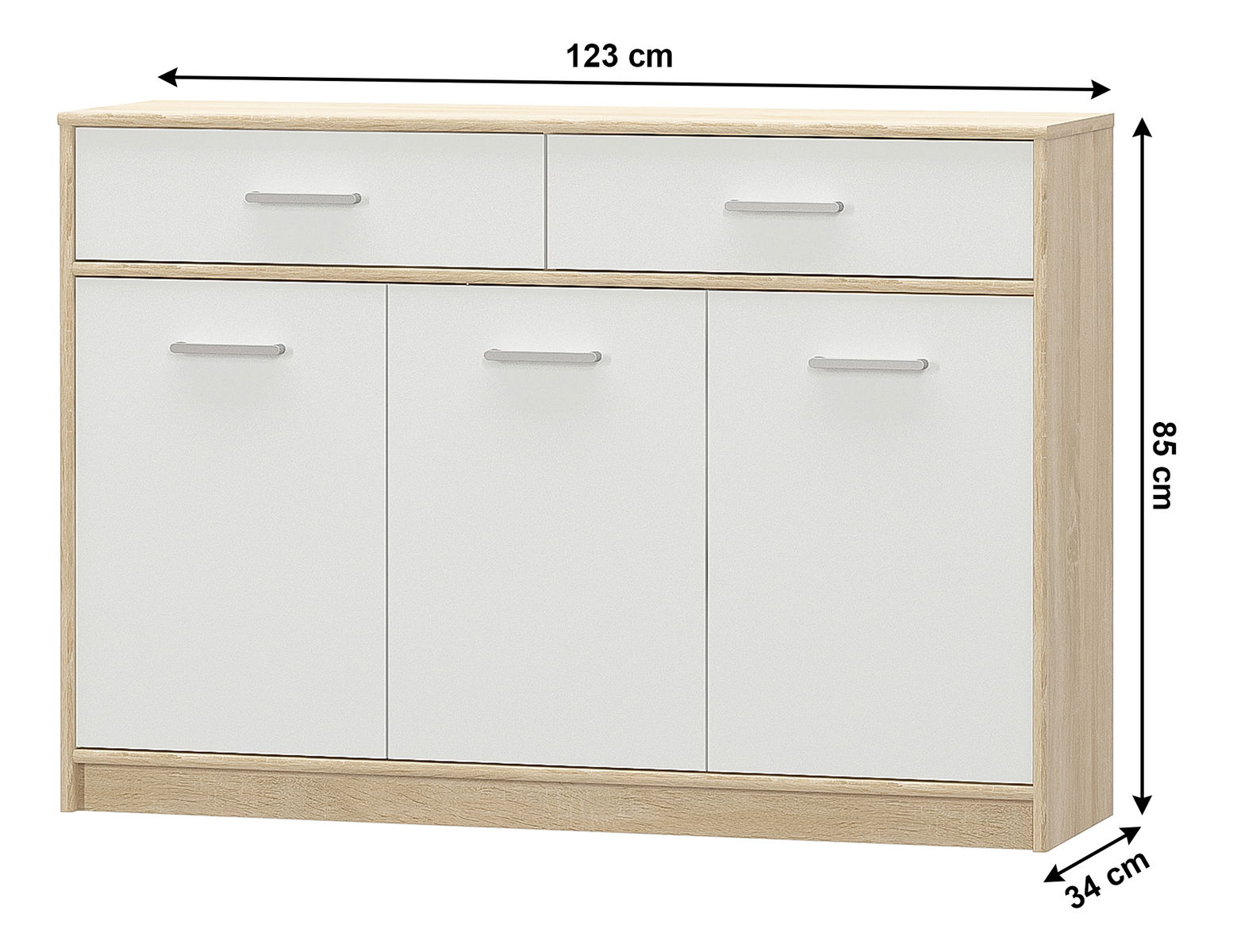 Prostorná komoda poskytující dostatek úložného prostoru. Hodí se zejména do dětského nebo studentského pokoje, ale poslouží i v obývacím pokoji, předsíni nebo ložnici. Komoda má dvě zásuvky a troje dvířka. Provedení komody je dub sonoma.