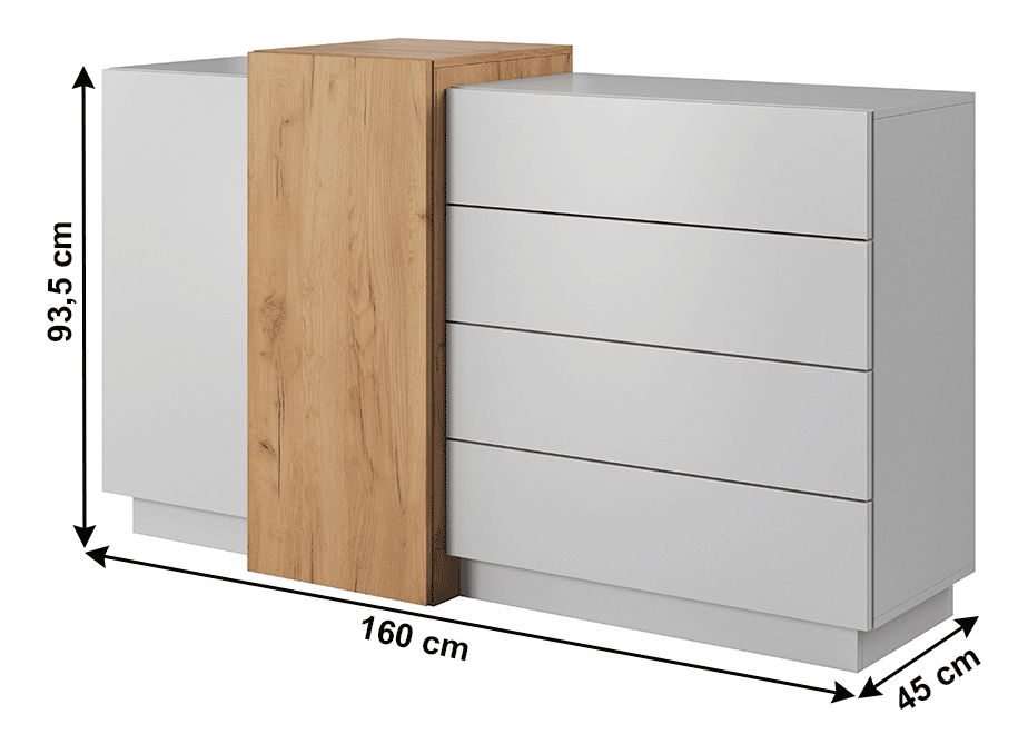 Komoda Trelop je moderní nábytek, který se skvěle hodí do každého interiéru. Tato bílá komoda s detailem z dubu craft zlatého má výšku 93,5 cm a hloubku 45 cm. Je vyrobena z kvalitní laminované DTD desky a její hrany jsou vybaveny ochranným ABS okrajem. Dotykový systém push up na dveřích a šuplících umožňuje snadné a pohodlné otevírání. Komoda Trelop je praktickým místem pro uskladnění a organizování vašich věcí. Díky svému elegantnímu designu a kvalitním materiálům bude skvělým doplňkem vašeho domova.