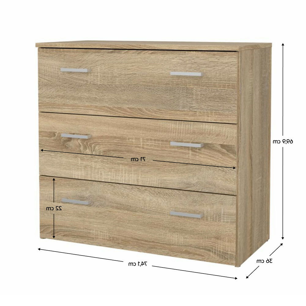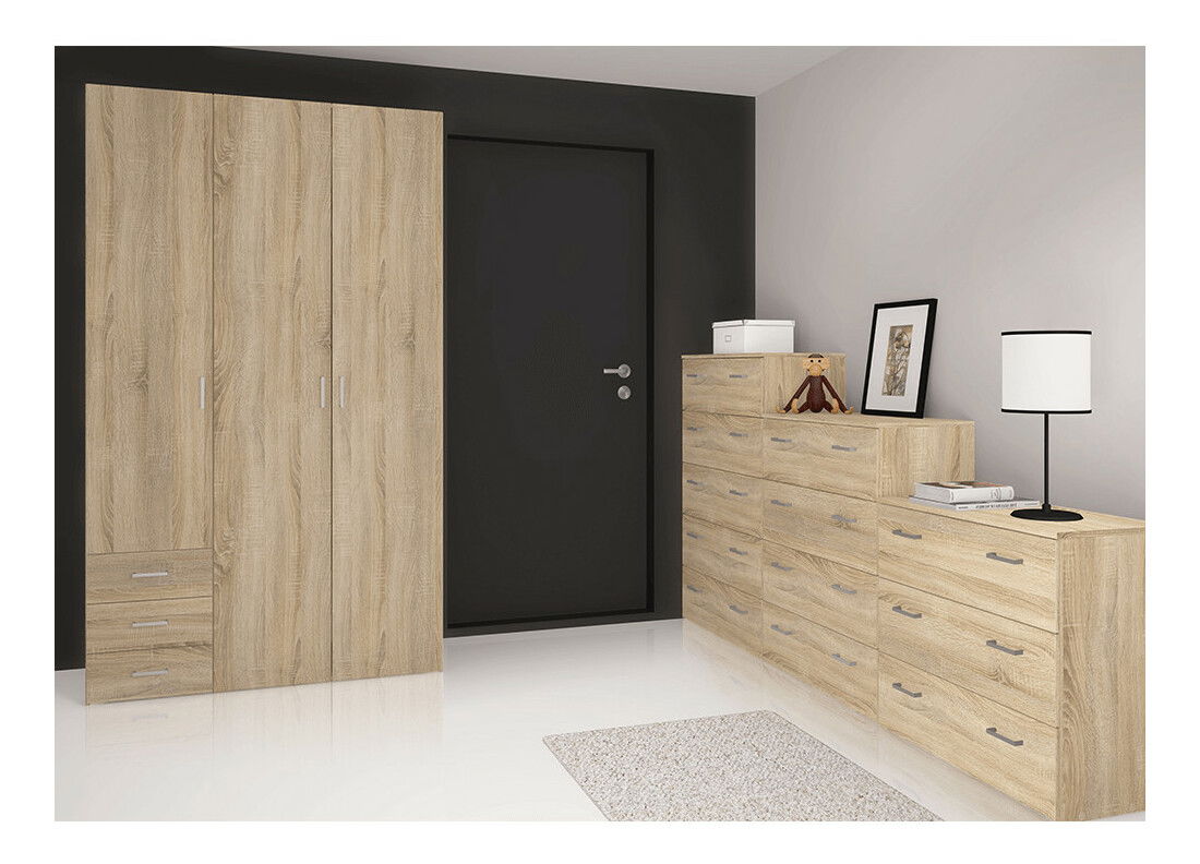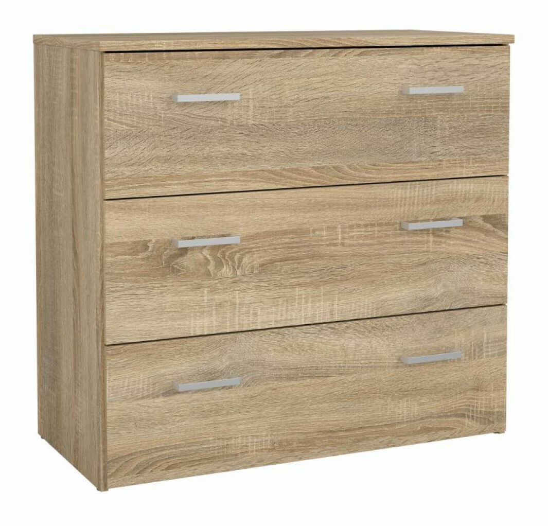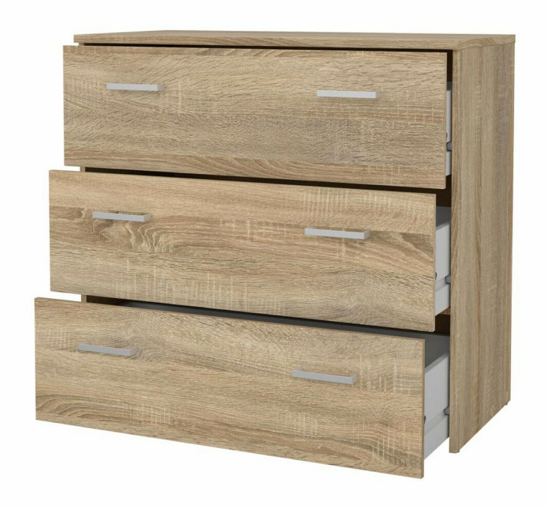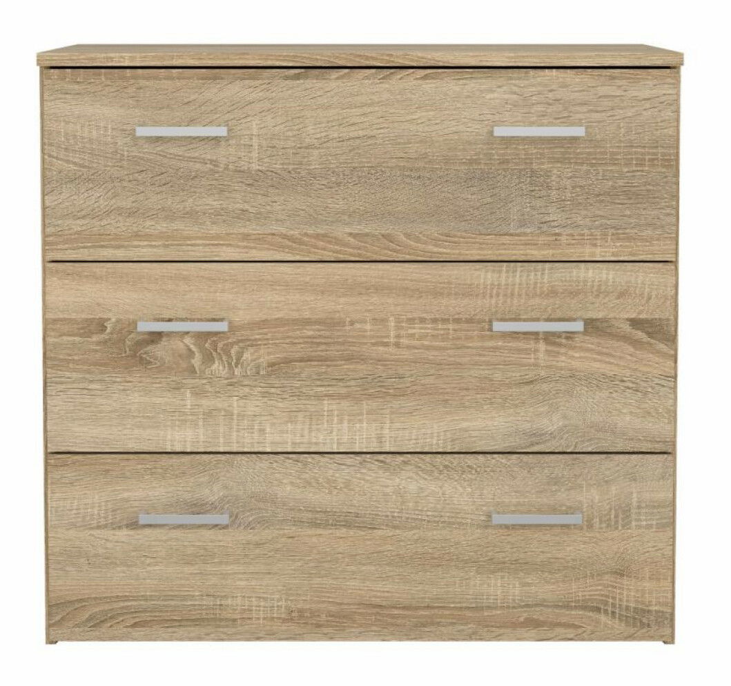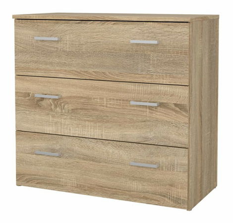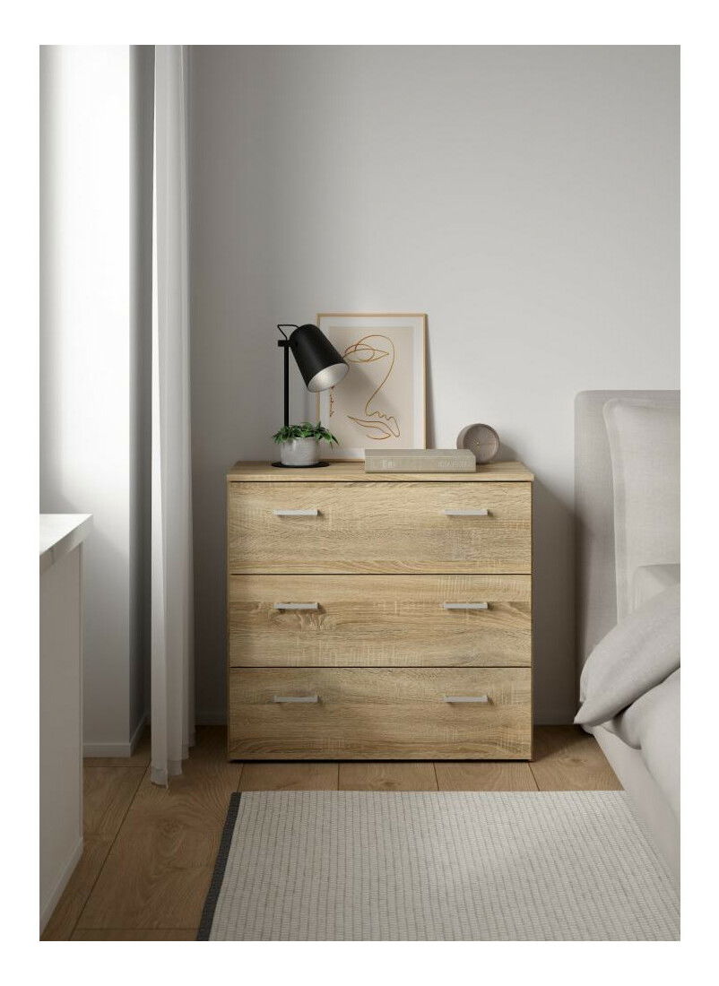 Moderní a praktická komoda má tři zásuvky, které se jednoduše otevírají pomocí úchytů. Přestože je menších rozměrů, poskytne množství úložného prostoru pro oblečení, doplňky a drobnosti. Díky příjemnému barevnému provedení dokonale zapadne do ložnici, obývacích pokojů, pracoven nebo předsíní. Dodáváme v demontu.