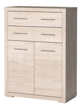 Jednoduchá vysoká komoda z kolekce Vega. Má dvě prostorné zásuvky, ideální pro oblečení nebo dokumenty. Pod nimi se nacházejí dvoje dvířka, za kterými je příčka a police, což umožňuje dobrou organizaci a správu velkého množství věcí. Kovové úchyty umocňují jedinečnost tohoto kusu nábytku. Vhodná do obývacího pokoje i kanceláře, můžete s ním vytvořit mnoho aranžmá.