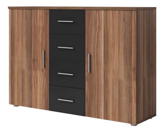 Třídílná komoda v moderním designu Vám umožní uspořádat si oblečení tak, abyste v něm měli přehled. Komoda obsahuje dvě skříňky po stranách a čtyři zásuvky uprostřed. V skříňkách se nachází polička, která nabízí dostatek úložného prostoru. Na vrch komody si můžete umístit dekorativní předměty, lampičku nebo vázu s květinami.