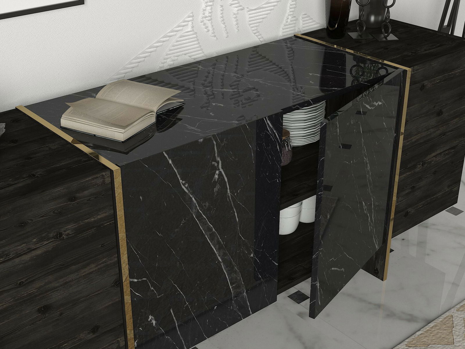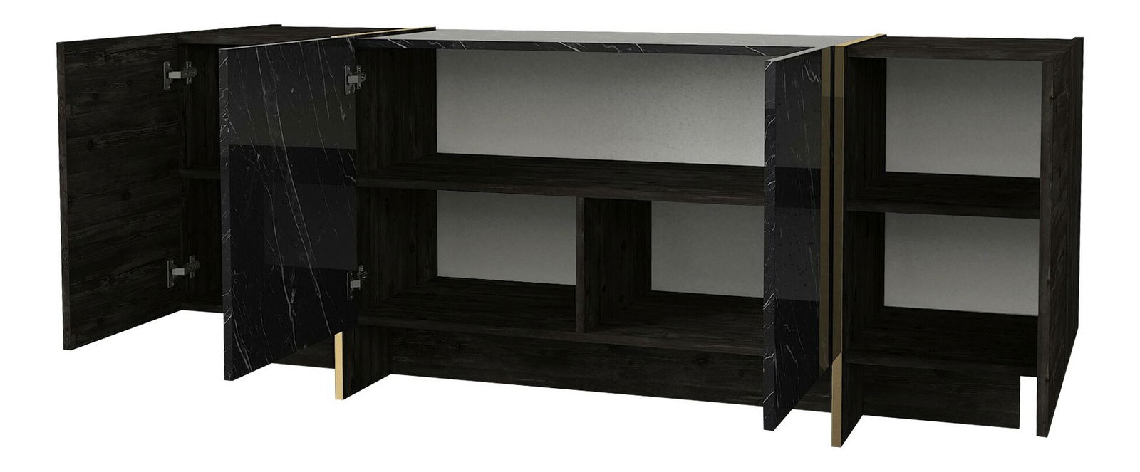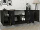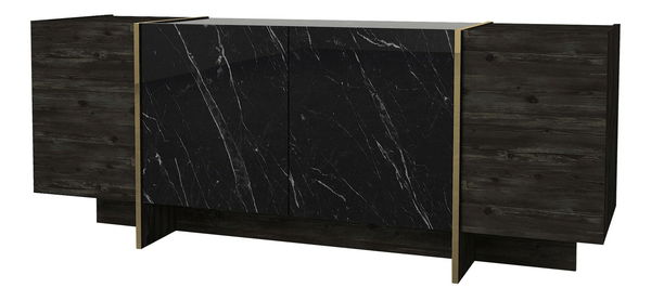 Komoda Veya má moderní design a je vyrobena z kvalitní 100% melaminové desky. Její černá barva s detaily ve zlaté barvě přinese do vašeho interiéru stylový a elegantní vzhled. S výškou 75,5 cm, šířkou 180 cm a hloubkou 46,6 cm poskytuje dostatek úložného prostoru pro vaše věci. Tato komoda je ideální pro vaši ložnici nebo obývací pokoj a její kvalitní zpracování zaručuje dlouhou životnost. S Veyou budete mít vždy vše na svém místě a váš dům bude vypadat skvěle.