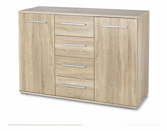 ZobrazitUdělejte si doma pořádek díky této prostorné třídílné komodě. Komoda má pěkný moderní design a příjemné barevné provedení kombinovatelné s dalšími prvky v místnosti. Po bocích se nacházejí skříňky a uprostřed komody jsou čtyři zásuvky. V každé ze skříněk se nachází police. Dvířka a zásuvky komody se otevírají pomocí podlouhlých tenkých úchytů.