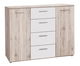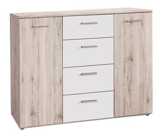 Třídílná komoda s dvířky po stranách a 4 zásuvkami nad sebou s bílým odstínem fronty ve středu. Materiál: DTD fóliovaný