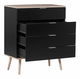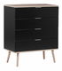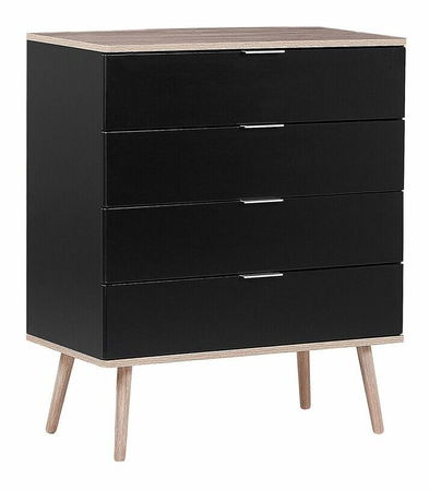 Tato komoda je vynikající volbou, hledáte-li kus nábytku, který poskytuje praktický úložný prostor a zároveň se hodí do různých interiérů. Trvanlivost nábytku zajišťují dřevěné nohy, čelo z MDF desky a další části z dřevotřískové desky v černé barvě. Minimalistická komoda se šuplíky bude perfektní na oblečení, kancelářské potřeby a ostatní drobné předměty, což vám umožní udržovat pořádek v místnosti.