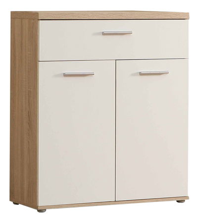 Dvoudílná komoda se zásuvkou v horní části, pod kterou se nachází úložný prostor s poličkou uzavřen dvěma dvířky.