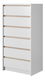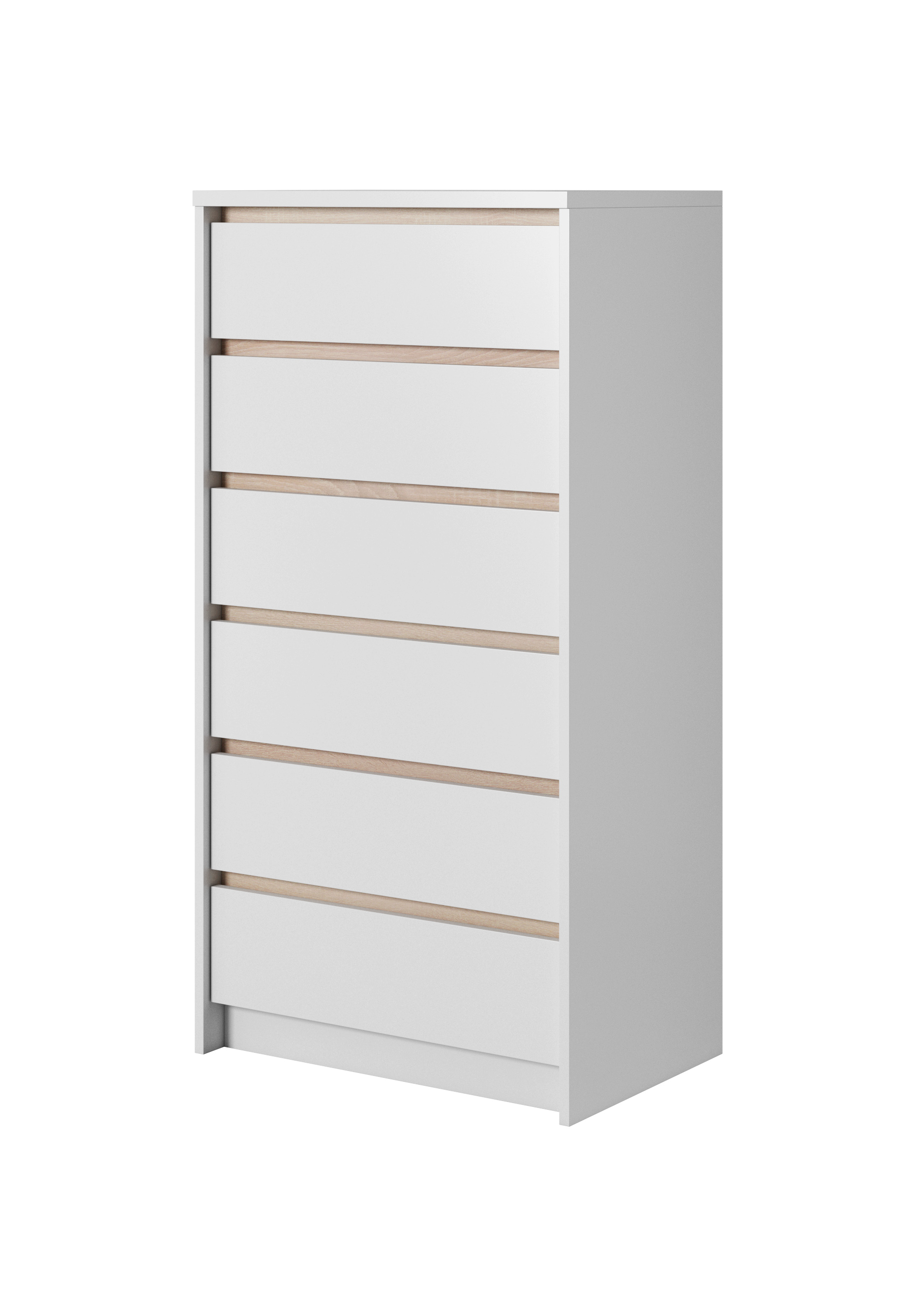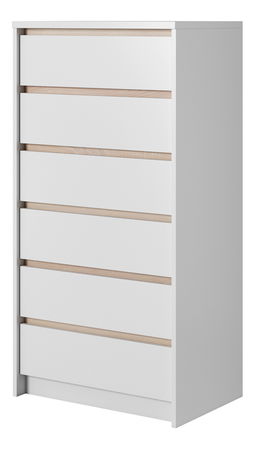 Úzká a vysoká komoda se šesti zásuvkami. Je praktická a hodí se do každé ložnice, studentského pokoje či předsíně.