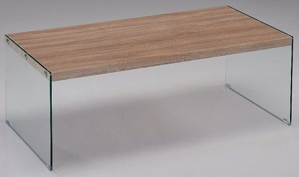 Jednoduchý konferenční stolek se skleněnými nohami. 8 mm čiré tvrzené sklo použité na bočních nohou, horní deska ze dřeva v provedení dub sonoma.
