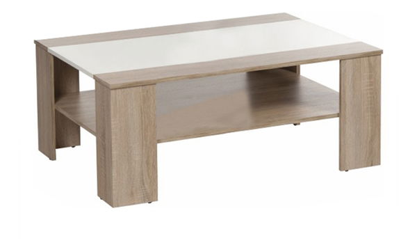Konferenční stolek Ariadna je vyroben z fóliované DTD v odstínu dřeva dub sonoma. Ve středu vrchní desky se nachází bílý pruh z lamina s extra vysokým leskem HG. Pod ní je umístěna praktická polička na odkládání věcí, které chcete mít vždy po ruce.