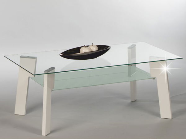 Moderní konferenční stolek s tenkými nožičkami, skleněnou poličkou na odkládání novin nebo časopisů a vrchní deskou z čirého skla. Nožičky stolku jsou v provedení vysokého bílého lesku.