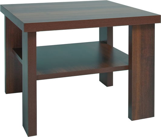 Čtvercový konferenční stolek s širšími nožičkami a poličkou / úložným prostorem / pod horní deskou vhodný do obývacího pokoje, jídelny nebo ložnice. Nožičky jsou umístěny dvěma způsoby ( otočení o 90 stupňů). Vyrábí se v provedení Olše a Ořech.
