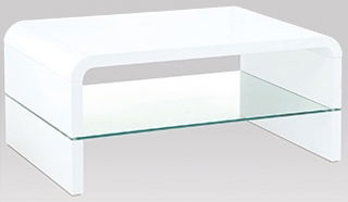 Konferenční stolek vyrobený ze dřeva (MDF) ve vysokém lesku bílém. Odkládací polička je z tlustého čirého tvrzeného skla.