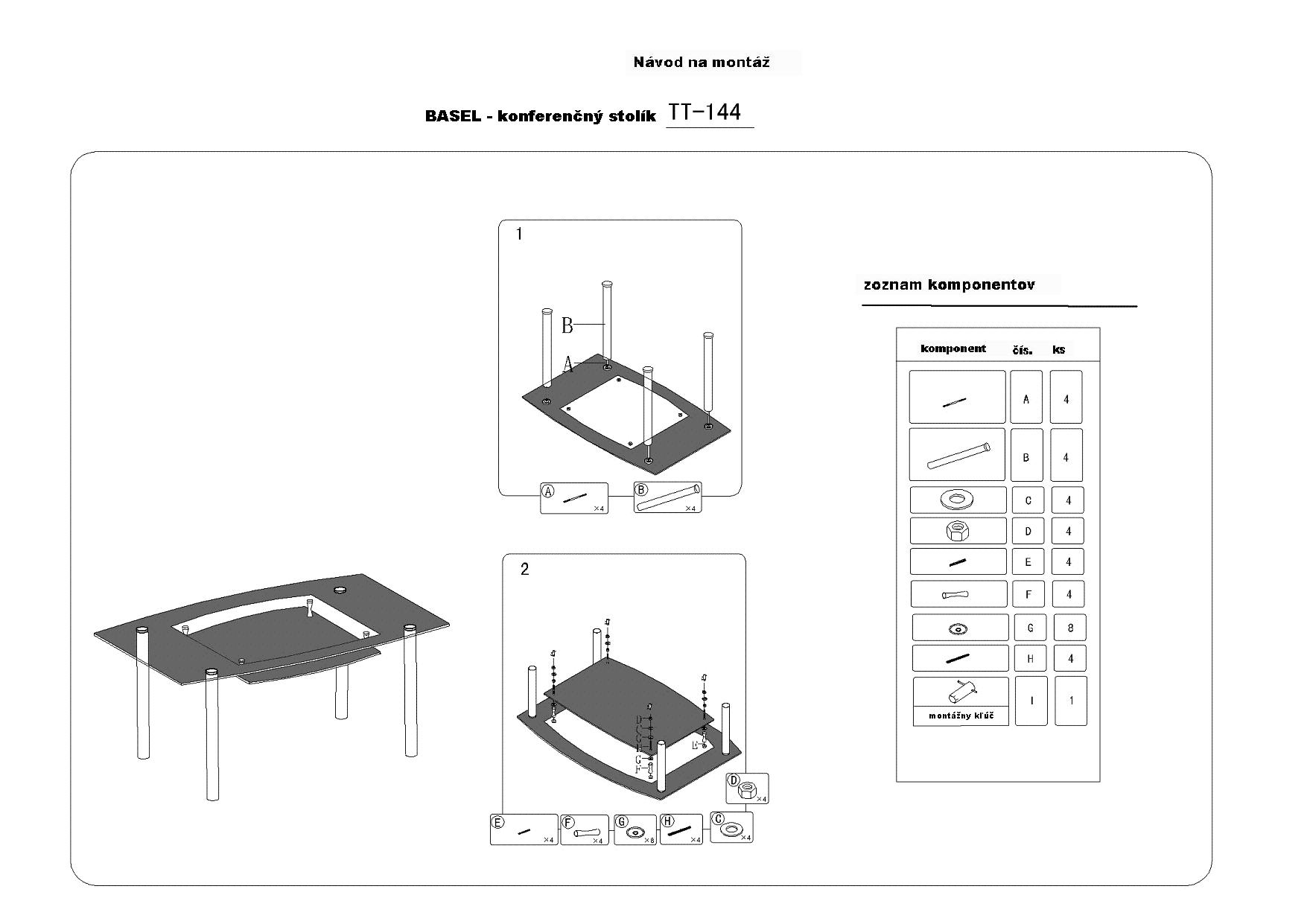 Luxusní konferenční stolek Basel-Ervin má masivní ocelové nohy, které podpírají hlavní odkládací plochu. Ta je z čirého tvrzeného skla a na okraji se nachází černý pás. Dolní polička je také skleněná, ale obarvená na černo.