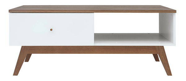 I v obývacím pokoji můžete mít krásný designový kus nábytku. Tento konferenční stolek Vás zaujme svým jedinečným stylem a přitažlivým barevným provedením. Konferenční stolek má praktickou zásuvku a otevřenou poličku na odkládání novin, knih a jiných drobností. Stolek stojí na dřevěných nožkách. Zásuvka má drobný dřevěný úchyt.