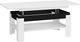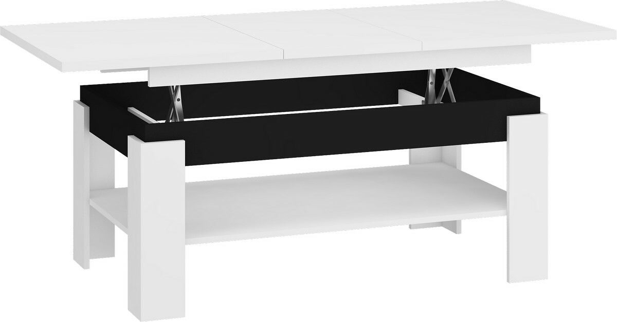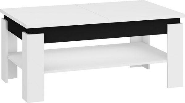 Zajímavý kus nábytku. Konferenční stolek s funkcí zvedání a rozkládání horní desky. Horní deska se zvedá pomocí kliky. Standardní šířka horní desky je 120 cm, po rozložení je široká 160 cm. Základní výška stolku je 53 cm. Po zvednutí o 16 cm se dostaneme k výšce 69 cm, což je velmi praktické při společenských událostech, kde stolek slouží jako odkládací místo. Provedení je bílá barva s ozdobným prvkem z černého pásu umístěného vodorovně po obvodu horní desky. Pod horní deskou je umístěna polička na odkládání.