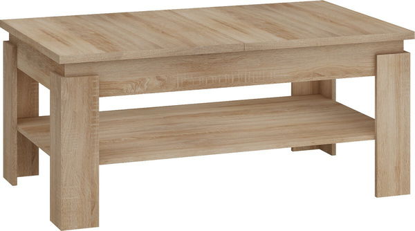 Zajímavý kus nábytku. Konferenční stolek s funkcí zvedání a rozkládání horní desky. Horní deska se zvedá pomocí kliky. Standardní šířka horní desky je 120 cm, po rozložení je široká 160 cm. Základní výška stolku je 53 cm. Po zvednutí o 16 cm se dostaneme k výšce 69 cm, což je velmi praktické při společenských událostech, kde stolek slouží jako odkládací místo. Dodávané provedení je dub sonoma světlá. Pod horní deskou je umístěna polička na odkládání.