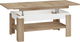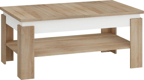 Zajímavý kus nábytku. Konferenční stolek s funkcí zvedání a rozkládání horní desky. Horní deska se zvedá pomocí kliky. Standardní šířka horní desky je 120 cm, po rozložení je široká 160 cm. Základní výška stolku je 53 cm. Po zvednutí o 16 cm se dostaneme k výšce 69 cm, což je velmi praktické při společenských událostech, kde stolek slouží jako odkládací místo. Dodávané provedení je dub sonoma světlá v kombinaci s bílým vodorovným pásem umístěným po obvodu pod horní deskou. Pod horní deskou je umístěna polička na odkládání.