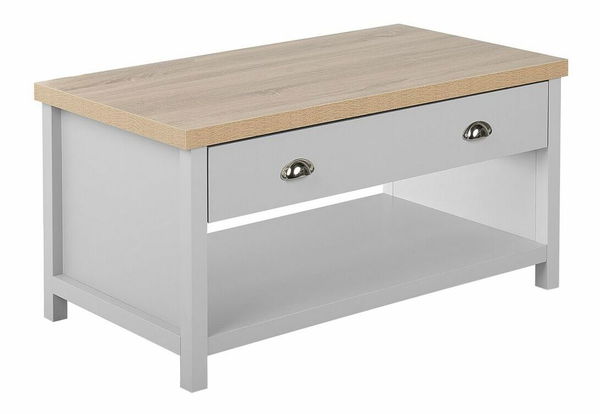 Díky svému elegantnímu designu a klasickému tvaru se tento konferenční stolek hodí do tradičních a současných interiérů. Díky široké a prostorné zásuvce a polici umístěné ve spodní části je ideální pro zábavu a nabízí dostatek prostoru pro podávání nápojů či vystavení oblíbených časopisů nebo dekoračních předmětů. Tento stolek s matnou šedou povrchovou úpravou a deskou v barvě dřeva doplní jakoukoli barevnou paletu interiérového zařízení.