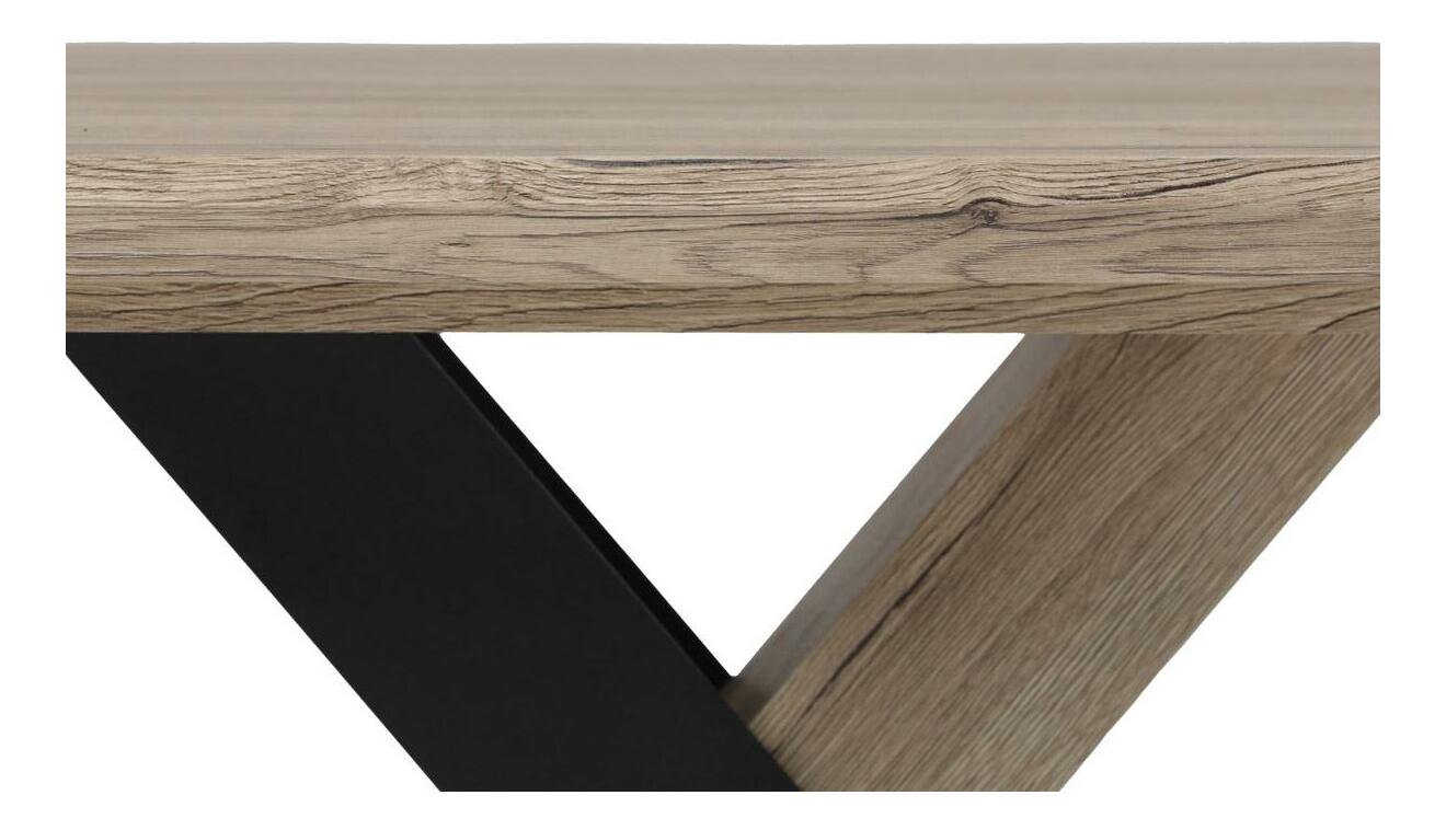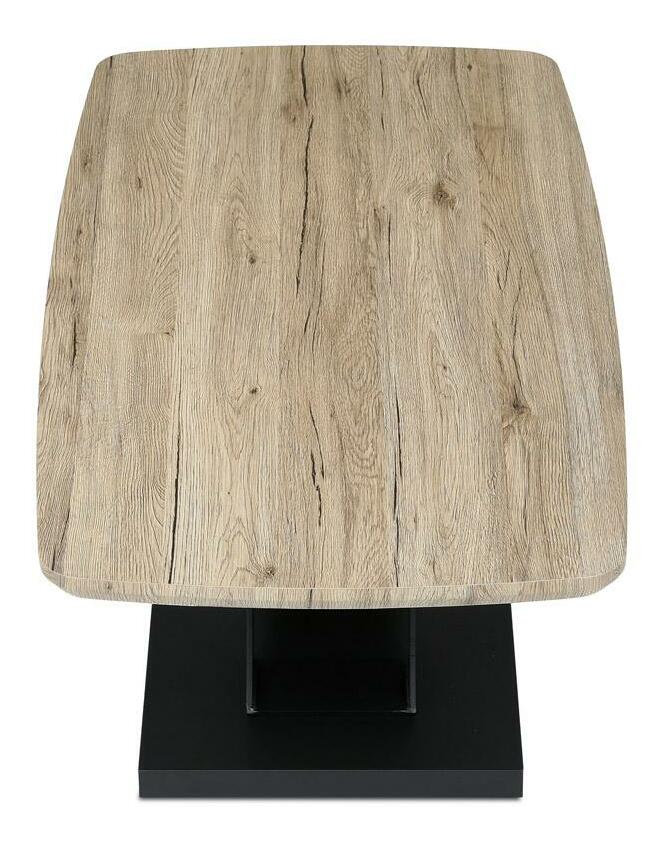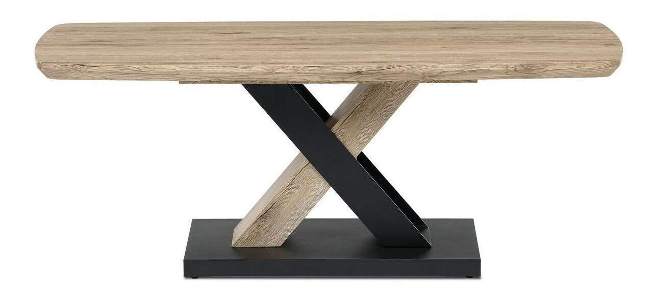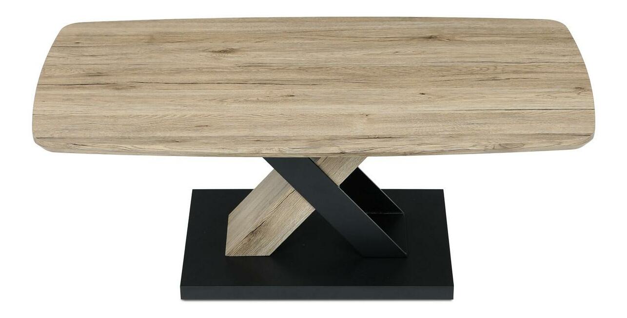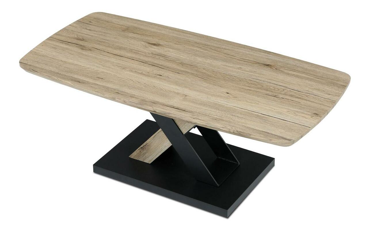 Konferenční stolek zaujme moderním designem s dekorem dubu San Remo, který vnese do vašeho obývacího pokoje příjemnou atmosféru. Atypická deska z MDF s matnou povrchovou úpravou upevněná na centrální konstrukci kombinuje přírodní a kovové prvky. Stabilní podnož zajišťuje pevnost a odolnost, díky čemuž je stolek nejen stylovým, ale také praktickým doplňkem. Ideální pro každodenní využití i jako reprezentativní prvek vašeho interiéru.