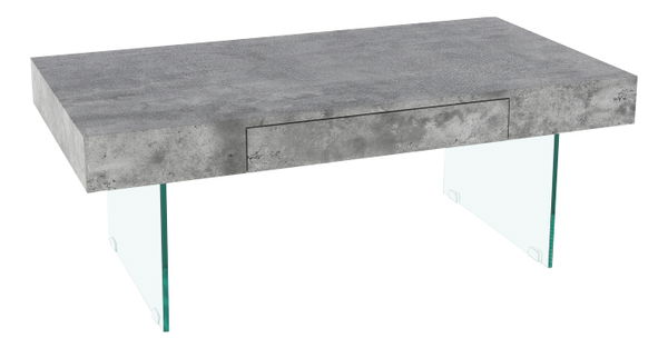 Jednoduchý konferenční stolek s moderním designem se skleněnými nohami a výraznou hrubou vrchní deskou. Zajímavým prvkem stolku je i praktická zásuvka, do které si můžete odložit noviny, časopisy a jiné drobnosti.